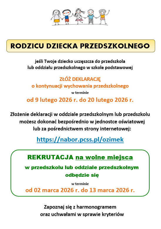 - W terminie od 9 lutego do 20 lutego 2026 r., Rodzice dzieci uczęszczających do Publicznego Przedszkola nr 2 z Oddziałami Integracyjnymi w Ozimku składają deklarację kontynuowania wychowania przedszkolnego na rok szkolny 2026/2027.